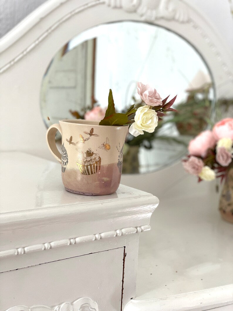 • Colour: matte milk white with pinky base/golden and grey cakes and bees all around the mug